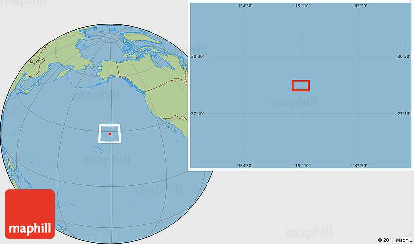 The location map of the area around 28° 47' 8" N, 151° 13' 29" W combines two projections: the orthographic azimuthal projection for the globe and the simple geographic projection for the rectangular part of the map. Geographic projection has straight meridians and parallels, each degree of latitude and longitude is the same size over the entire world map.