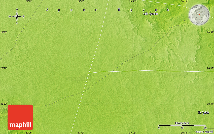 Physical map illustrates the mountains, lowlands, oceans, lakes and rivers and other physical landscape features of the area around 28° 47' 8" N, 29° 49' 30" E. Differences in land elevations relative to the sea level are represented by color.