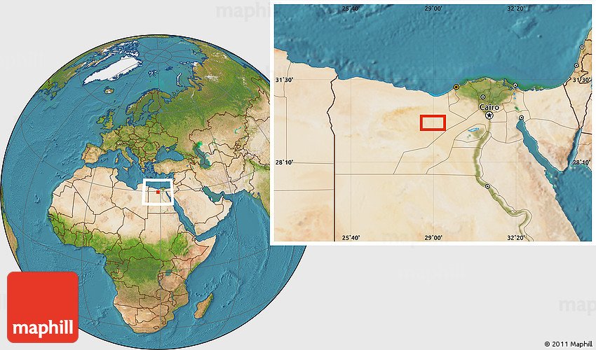 Maphill is a collection of map images. This image combines a satellite map with the globe centered on the area around 29° 44' 59" N, 28° 58' 30" E. Use the buttons under the image to switch to different map types.