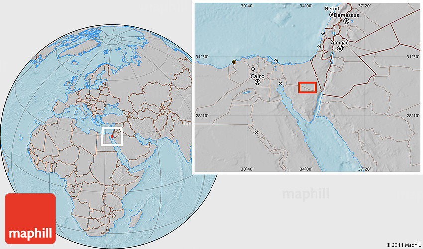 Maphill is a collection of map images. This image combines a gray map with the globe centered on the area around 29° 44' 59" N, 34° 4' 30" E. Use the buttons under the image to switch to different map types.