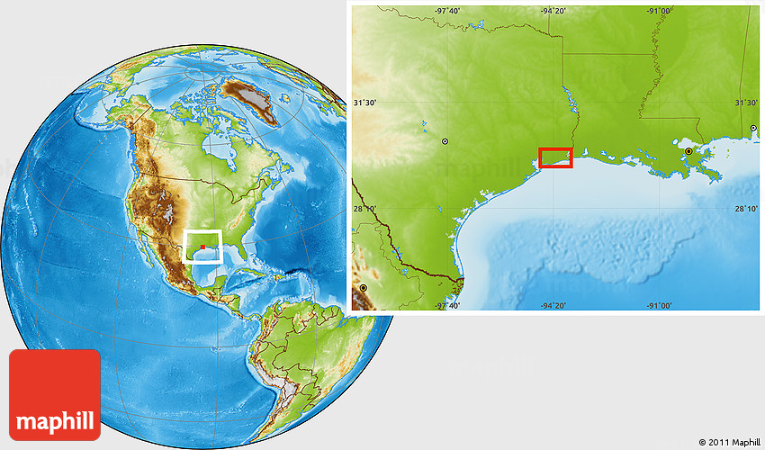 Maphill is a collection of map images. This image combines a physical map with the globe centered on the area around 29° 44' 59" N, 94° 16' 30" W. Use the buttons under the image to switch to different map types.
