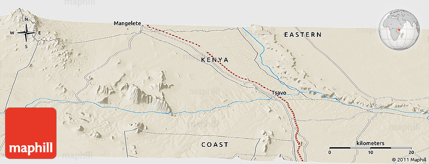 Shaded relief map shows landscape features, such as mountains, valleys and plateaus. Flat areas are smooth on the map, areas with steep slopes and mountains appear more rough. The above map of the area around 2° 58' 32" S, 38° 19' 30" E was created using a digital elevation model.