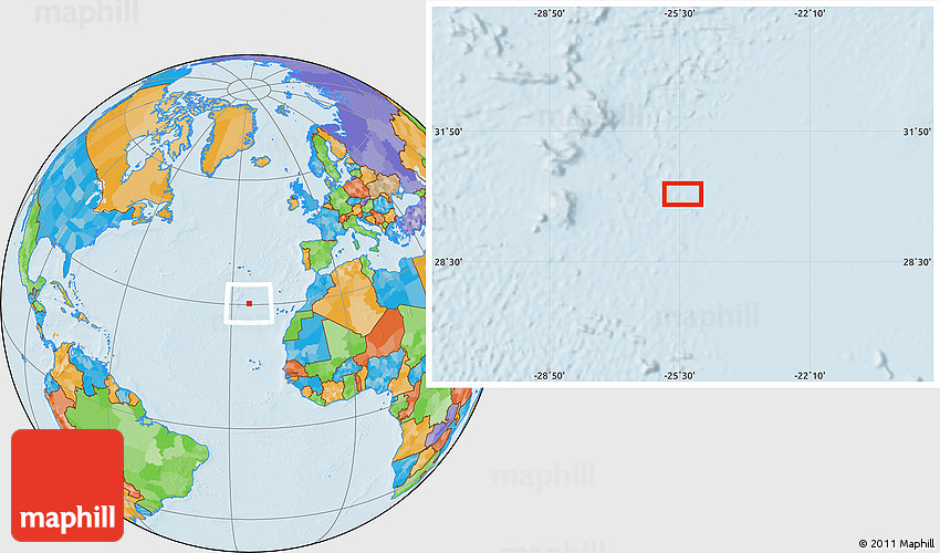 Maphill is a collection of map images. This image combines a political map with the globe centered on the area around 30° 13' 46" N, 25° 25' 29" W. Use the buttons under the image to switch to different map types.