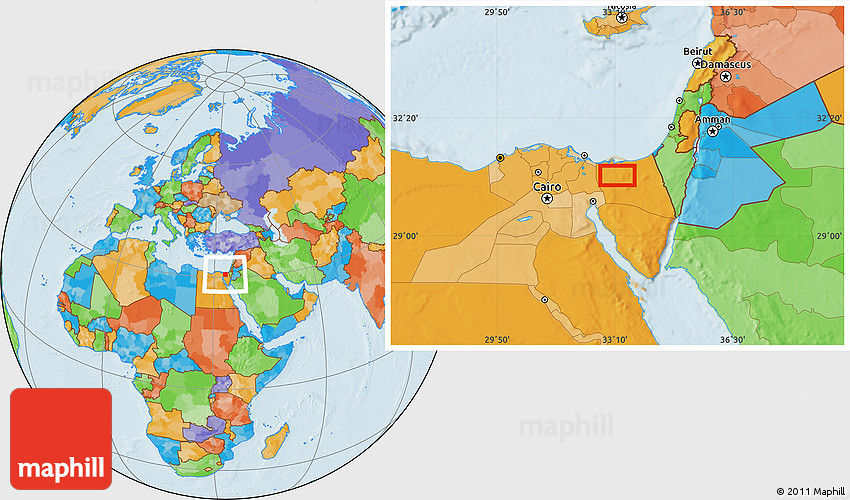 Maphill is a collection of map images. This image combines a political map with the globe centered on the area around 30° 42' 29" N, 33° 13' 30" E. Use the buttons under the image to switch to different map types.