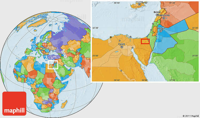 Maphill is a collection of map images. This image combines a political map with the globe centered on the area around 30° 42' 29" N, 34° 4' 30" E. Use the buttons under the image to switch to different map types.