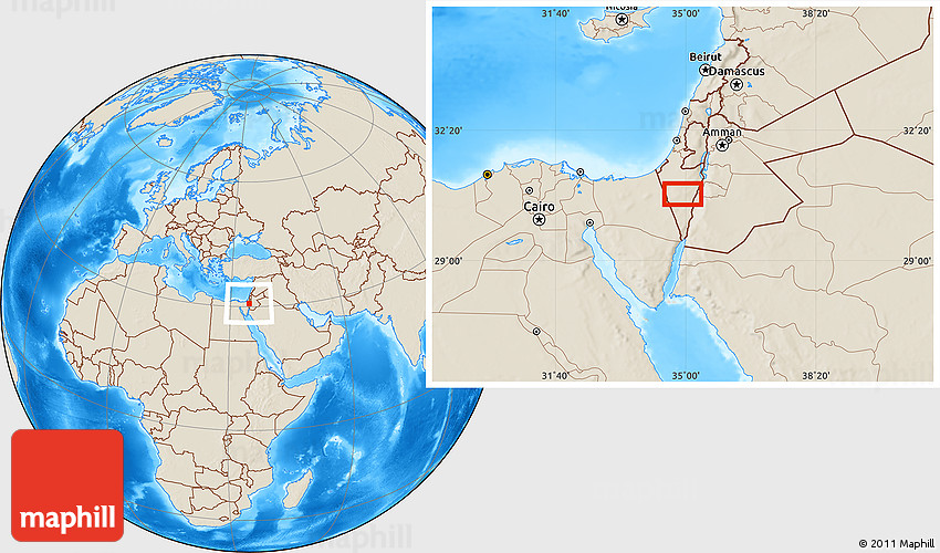 Maphill is a collection of map images. This image combines a shaded relief map with the globe centered on the area around 30° 42' 29" N, 34° 55' 29" E. Use the buttons under the image to switch to different map types.