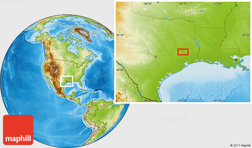 Maphill is a collection of map images. This image combines a physical map with the globe centered on the area around 30° 42' 29" N, 95° 7' 30" W. Use the buttons under the image to switch to different map types.