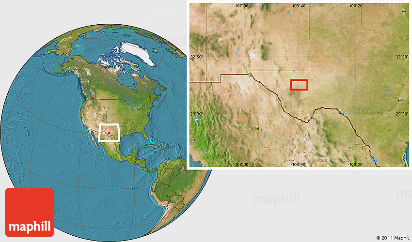 Maphill is a collection of map images. This image combines a satellite map with the globe centered on the area around 31° 11' 6" N, 103° 37' 30" W. Use the buttons under the image to switch to different map types.