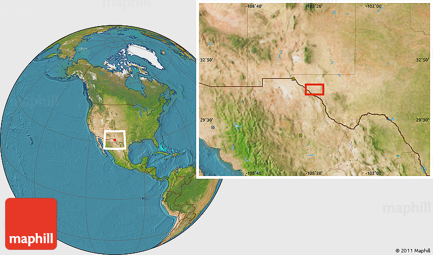 Maphill is a collection of map images. This image combines a satellite map with the globe centered on the area around 31° 11' 6" N, 105° 19' 29" W. Use the buttons under the image to switch to different map types.