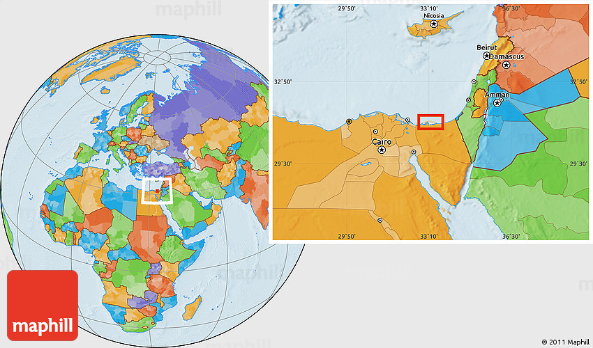 Maphill is a collection of map images. This image combines a political map with the globe centered on the area around 31° 11' 6" N, 33° 13' 30" E. Use the buttons under the image to switch to different map types.
