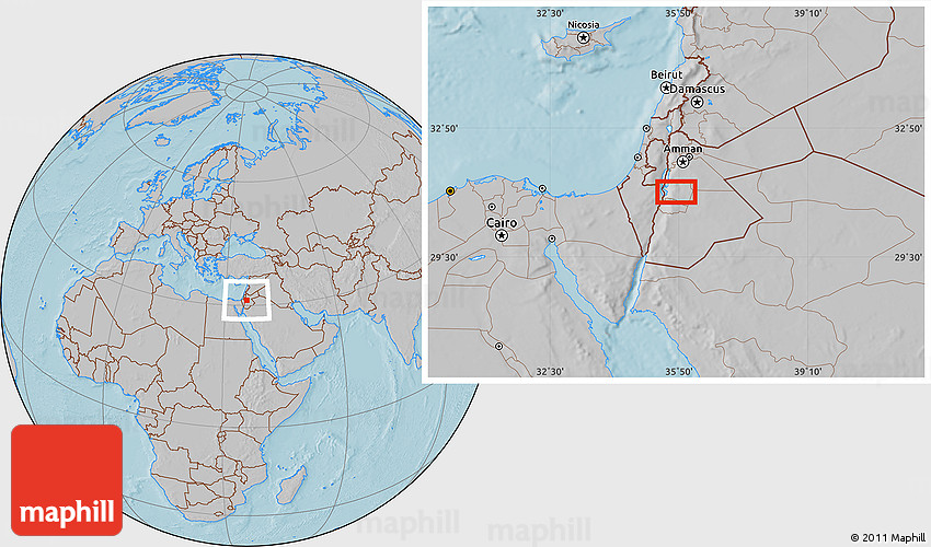 Maphill is a collection of map images. This image combines a gray map with the globe centered on the area around 31° 11' 6" N, 35° 46' 29" E. Use the buttons under the image to switch to different map types.