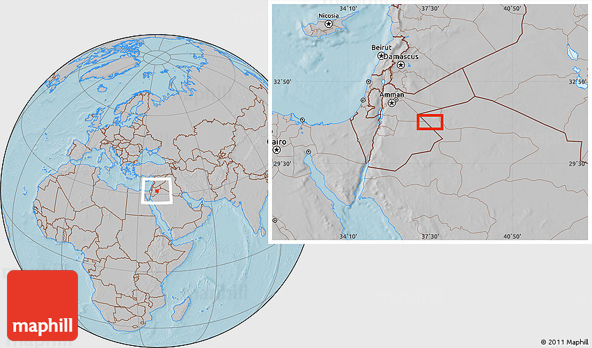 Maphill is a collection of map images. This image combines a gray map with the globe centered on the area around 31° 11' 6" N, 37° 28' 30" E. Use the buttons under the image to switch to different map types.