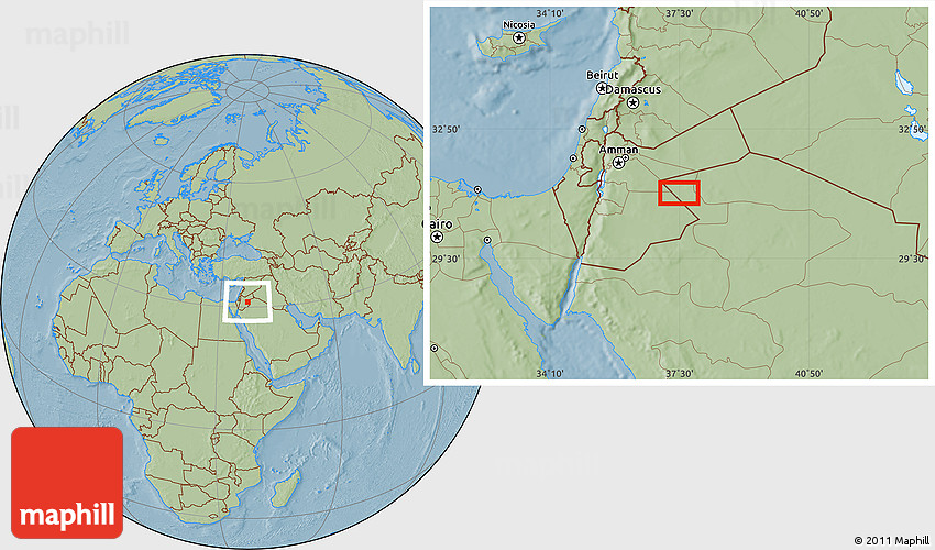 The location map of the area around 31° 11' 6" N, 37° 28' 30" E combines two projections: the orthographic azimuthal projection for the globe and the simple geographic projection for the rectangular part of the map. Geographic projection has straight meridians and parallels, each degree of latitude and longitude is the same size over the entire world map.