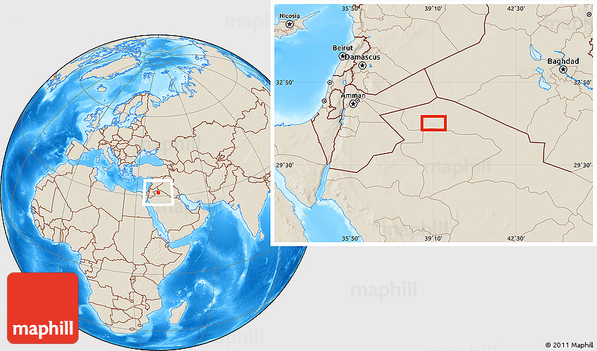 The location map of the area around 31° 11' 6" N, 39° 10' 29" E combines two projections: the orthographic azimuthal projection for the globe and the simple geographic projection for the rectangular part of the map. Geographic projection has straight meridians and parallels, each degree of latitude and longitude is the same size over the entire world map.