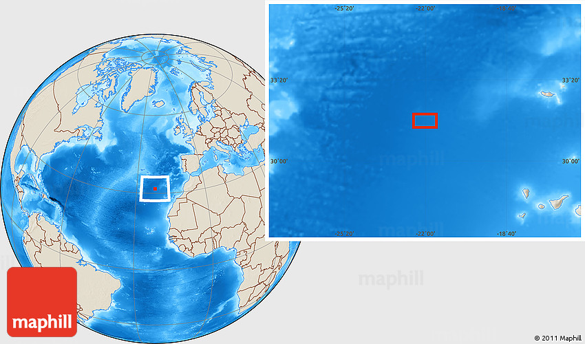 The location map of the area around 31° 39' 38" N, 22° 1' 29" W combines two projections: the orthographic azimuthal projection for the globe and the simple geographic projection for the rectangular part of the map. Geographic projection has straight meridians and parallels, each degree of latitude and longitude is the same size over the entire world map.