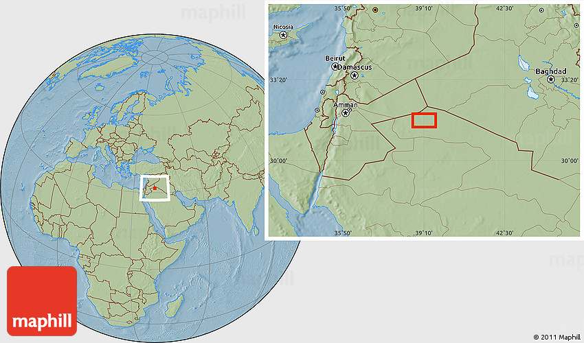 The location map of the area around 31° 39' 38" N, 39° 10' 29" E combines two projections: the orthographic azimuthal projection for the globe and the simple geographic projection for the rectangular part of the map. Geographic projection has straight meridians and parallels, each degree of latitude and longitude is the same size over the entire world map.