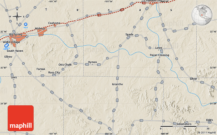 Embed the above shaded relief map of the area around 32° 8' 5" N, 101° 4' 29" W into your website. Enrich your blog with quality map graphics. Make the web a more beautiful place.