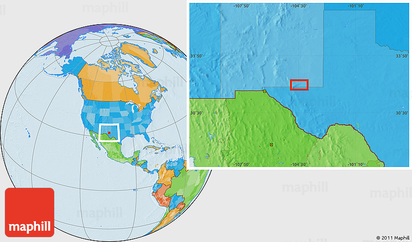 Maphill is a collection of map images. This image combines a political map with the globe centered on the area around 32° 8' 5" N, 104° 28' 29" W. Use the buttons under the image to switch to different map types.