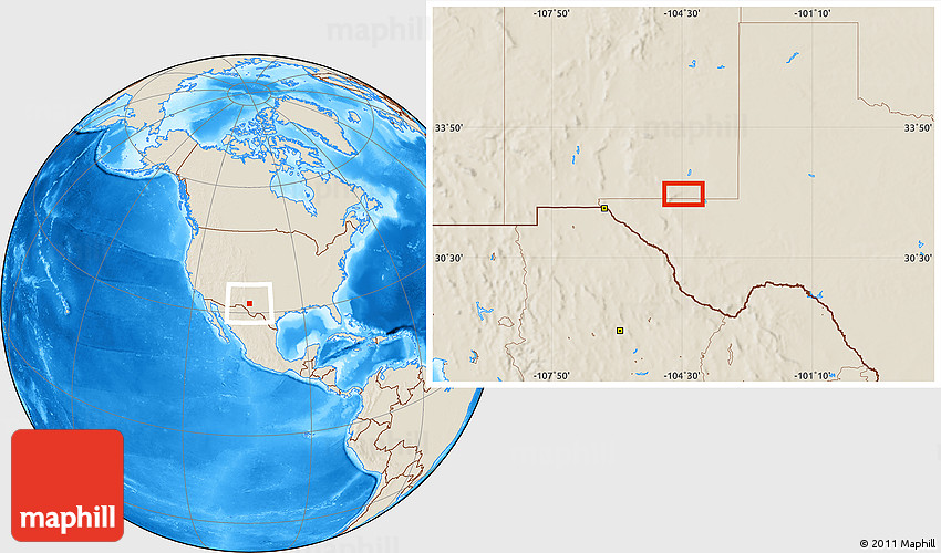 Maphill is a collection of map images. This image combines a shaded relief map with the globe centered on the area around 32° 8' 5" N, 104° 28' 29" W. Use the buttons under the image to switch to different map types.