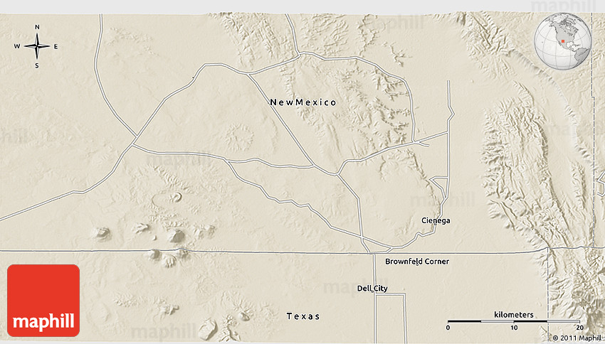 Shaded relief map shows landscape features, such as mountains, valleys and plateaus. Flat areas are smooth on the map, areas with steep slopes and mountains appear more rough. The above map of the area around 32° 8' 5" N, 105° 19' 29" W was created using a digital elevation model.