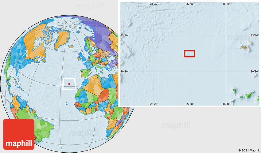 Maphill is a collection of map images. This image combines a political map with the globe centered on the area around 32° 8' 5" N, 22° 1' 29" W. Use the buttons under the image to switch to different map types.