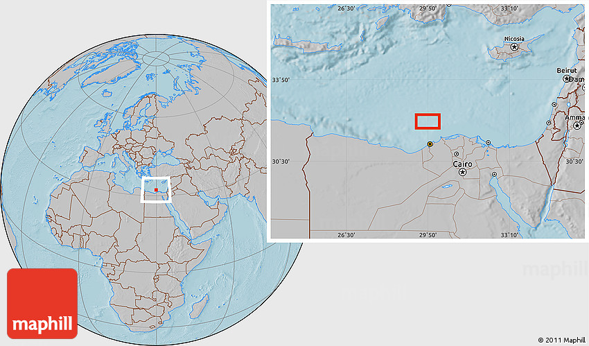 Maphill is a collection of map images. This image combines a gray map with the globe centered on the area around 32° 8' 5" N, 29° 49' 30" E. Use the buttons under the image to switch to different map types.
