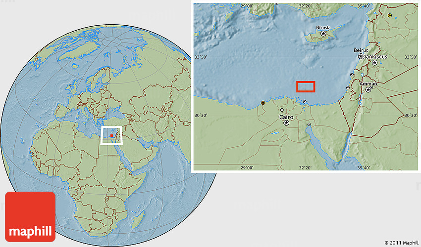 Maphill is a collection of map images. This image combines a savanna style map with the globe centered on the area around 32° 8' 5" N, 32° 22' 30" E. Use the buttons under the image to switch to different map types.