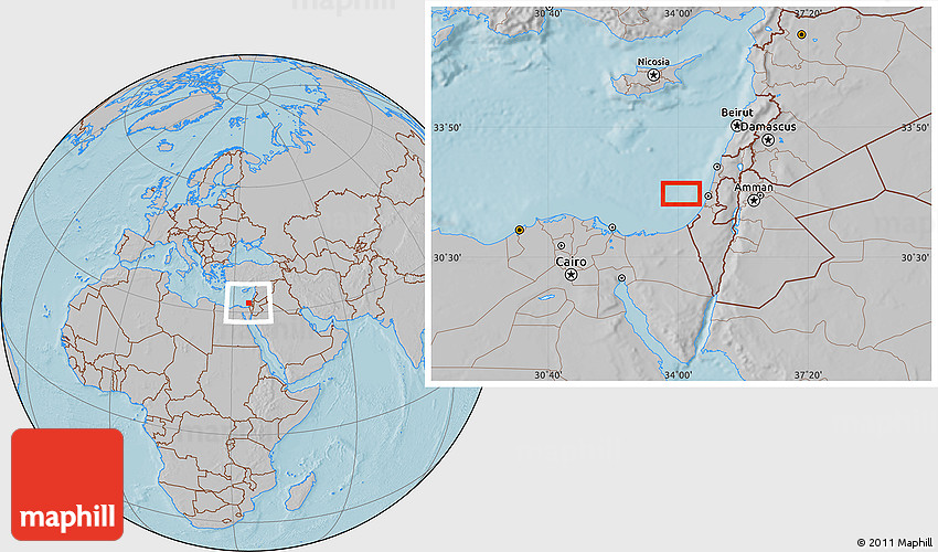 Maphill is a collection of map images. This image combines a gray map with the globe centered on the area around 32° 8' 5" N, 34° 4' 30" E. Use the buttons under the image to switch to different map types.