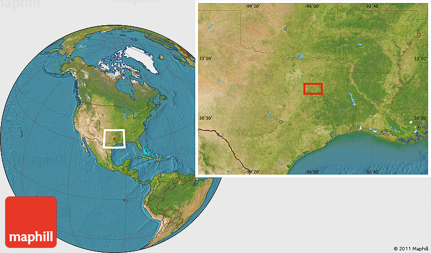 Maphill is a collection of map images. This image combines a satellite map with the globe centered on the area around 32° 8' 5" N, 95° 58' 29" W. Use the buttons under the image to switch to different map types.