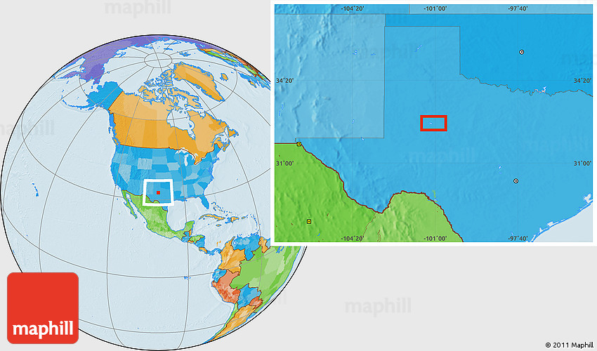Maphill is a collection of map images. This image combines a political map with the globe centered on the area around 32° 36' 26" N, 101° 4' 29" W. Use the buttons under the image to switch to different map types.