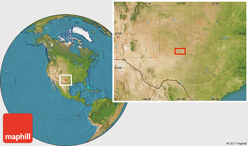 Maphill is a collection of map images. This image combines a satellite map with the globe centered on the area around 32° 36' 26" N, 101° 4' 29" W. Use the buttons under the image to switch to different map types.