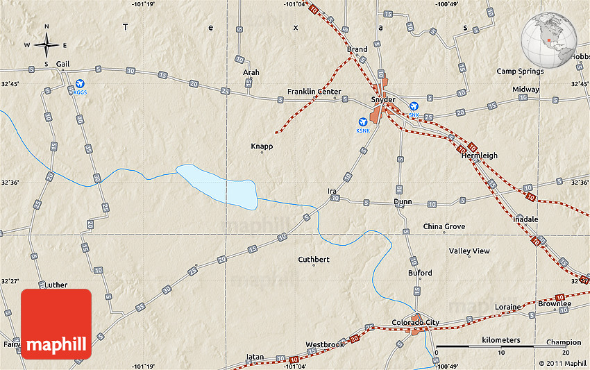 Maphill is a collection of map images. This shaded relief map of the area around 32° 36' 26" N, 101° 4' 29" W is one of them. Click on the Detailed button under the image to switch to a more detailed map.