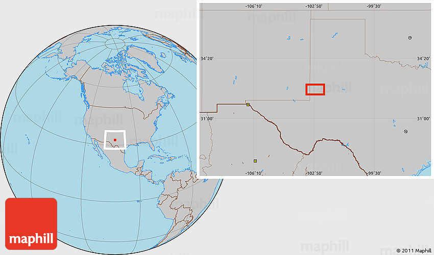 Maphill is a collection of map images. This image combines a gray map with the globe centered on the area around 32° 36' 26" N, 102° 46' 30" W. Use the buttons under the image to switch to different map types.