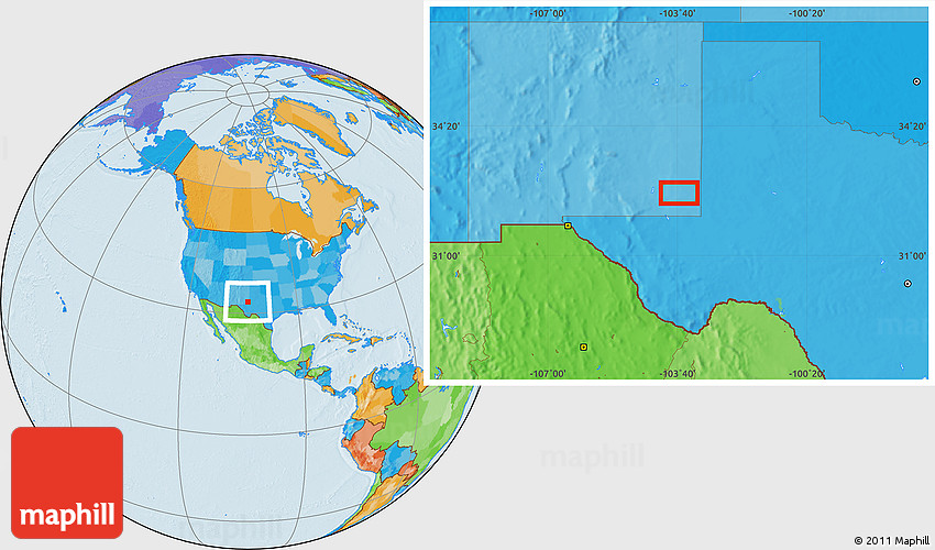 Maphill is a collection of map images. This image combines a political map with the globe centered on the area around 32° 36' 26" N, 103° 37' 30" W. Use the buttons under the image to switch to different map types.