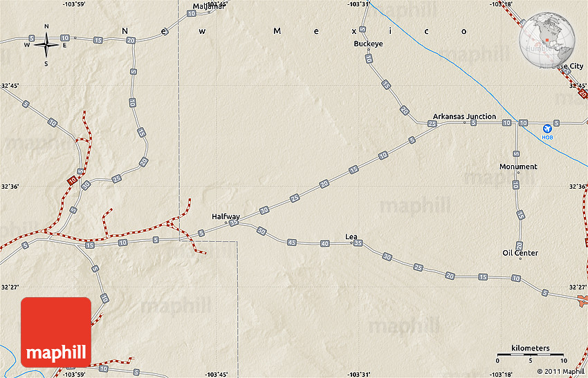 The value of Maphill lies in the possibility to look at the same area from several perspectives. Maphill presents the map of the area around 32° 36' 26" N, 103° 37' 30" W in a wide variety of map types and styles.