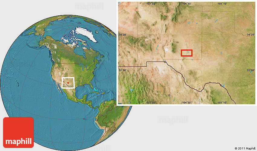 Maphill is a collection of map images. This image combines a satellite map with the globe centered on the area around 32° 36' 26" N, 104° 28' 29" W. Use the buttons under the image to switch to different map types.