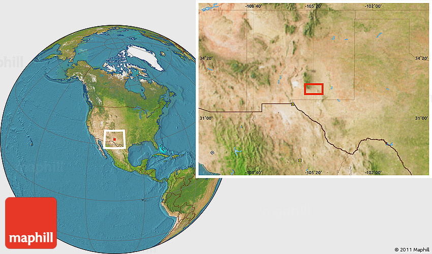 Maphill is a collection of map images. This image combines a satellite map with the globe centered on the area around 32° 36' 26" N, 105° 19' 29" W. Use the buttons under the image to switch to different map types.