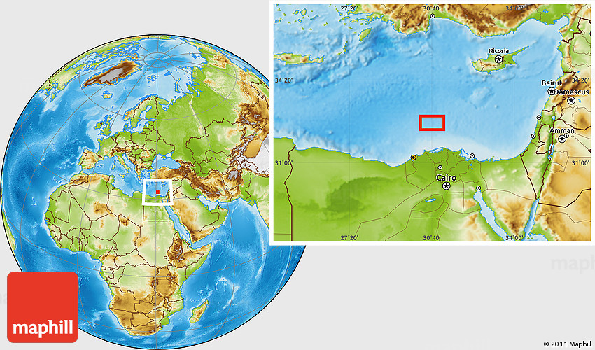 Maphill is a collection of map images. This image combines a physical map with the globe centered on the area around 32° 36' 26" N, 30° 40' 29" E. Use the buttons under the image to switch to different map types.