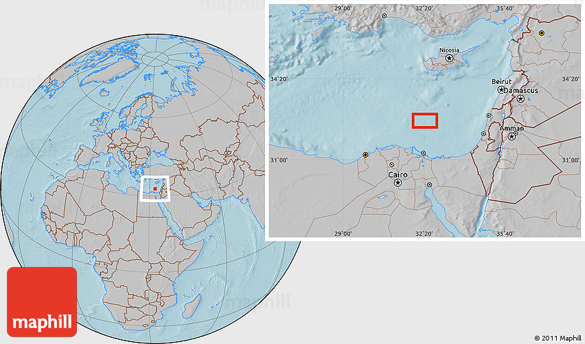 Maphill is a collection of map images. This image combines a gray map with the globe centered on the area around 32° 36' 26" N, 32° 22' 30" E. Use the buttons under the image to switch to different map types.