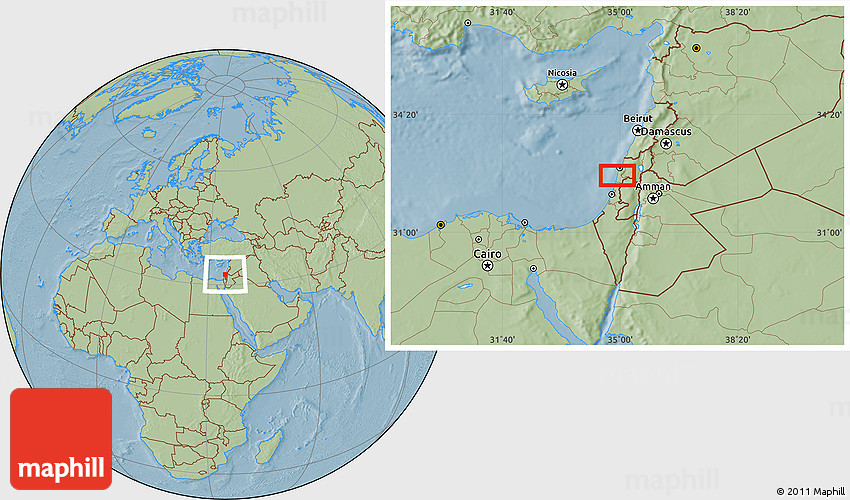 Maphill is a collection of map images. This image combines a savanna style map with the globe centered on the area around 32° 36' 26" N, 34° 55' 29" E. Use the buttons under the image to switch to different map types.