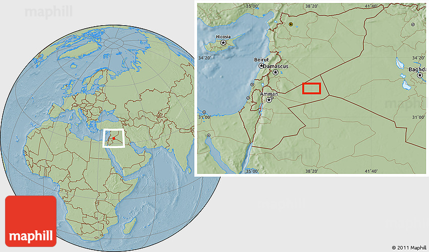 Maphill is a collection of map images. This image combines a savanna style map with the globe centered on the area around 32° 36' 26" N, 38° 19' 30" E. Use the buttons under the image to switch to different map types.