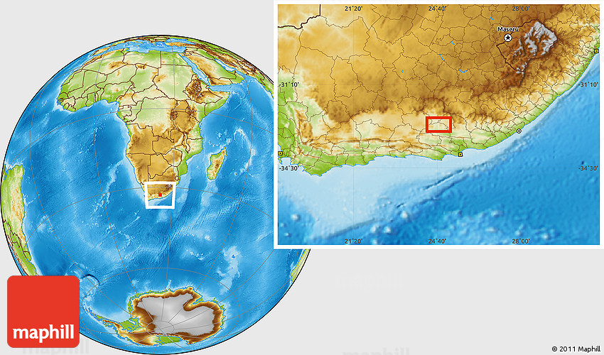 Maphill is a collection of map images. This image combines a physical map with the globe centered on the area around 32° 45' 51" S, 24° 43' 30" E. Use the buttons under the image to switch to different map types.