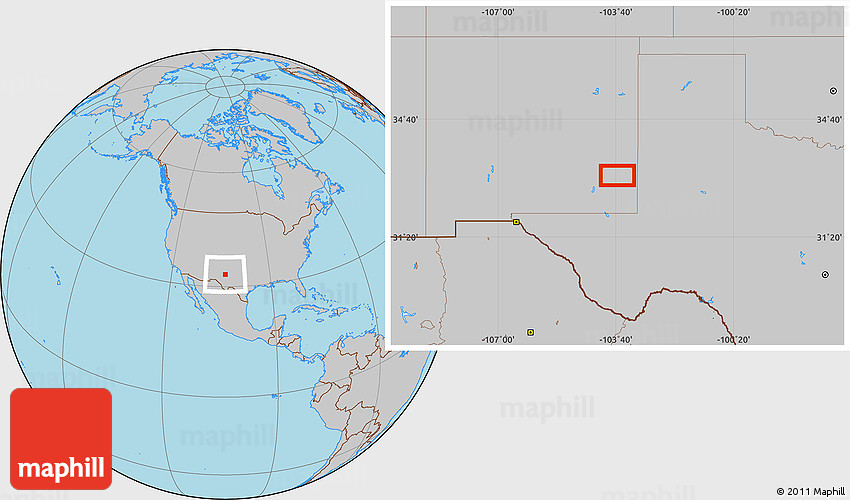 Maphill is a collection of map images. This image combines a gray map with the globe centered on the area around 33° 4' 42" N, 103° 37' 30" W. Use the buttons under the image to switch to different map types.