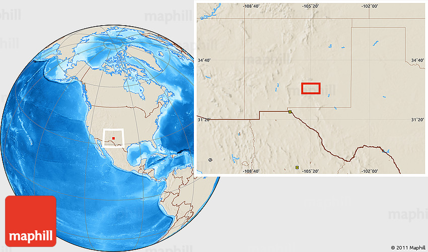 Maphill is a collection of map images. This image combines a shaded relief map with the globe centered on the area around 33° 4' 42" N, 105° 19' 29" W. Use the buttons under the image to switch to different map types.