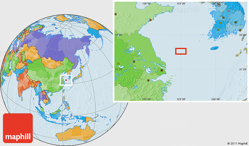 Maphill is a collection of map images. This image combines a political map with the globe centered on the area around 33° 4' 42" N, 123° 19' 29" E. Use the buttons under the image to switch to different map types.