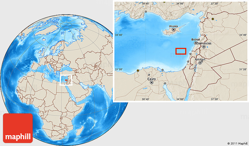 Maphill is a collection of map images. This image combines a shaded relief map with the globe centered on the area around 33° 4' 42" N, 34° 4' 30" E. Use the buttons under the image to switch to different map types.