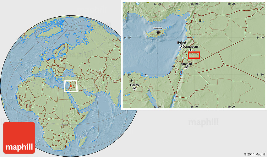 Maphill is a collection of map images. This image combines a savanna style map with the globe centered on the area around 33° 4' 42" N, 36° 37' 30" E. Use the buttons under the image to switch to different map types.