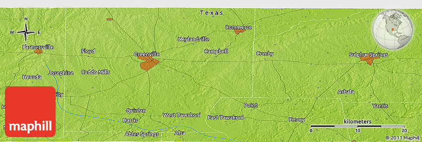 Embed the above physical panoramic map of the area around 33° 4' 42" N, 95° 58' 29" W into your website. Enrich your blog with quality map graphics. Make the web a more beautiful place.