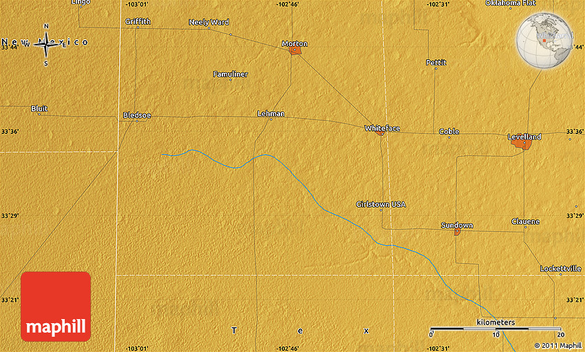 Maphill is a collection of map images. This physical map of the area around 33° 32' 52" N, 102° 46' 30" W is one of them. Click on the Detailed button under the image to switch to a more detailed map.