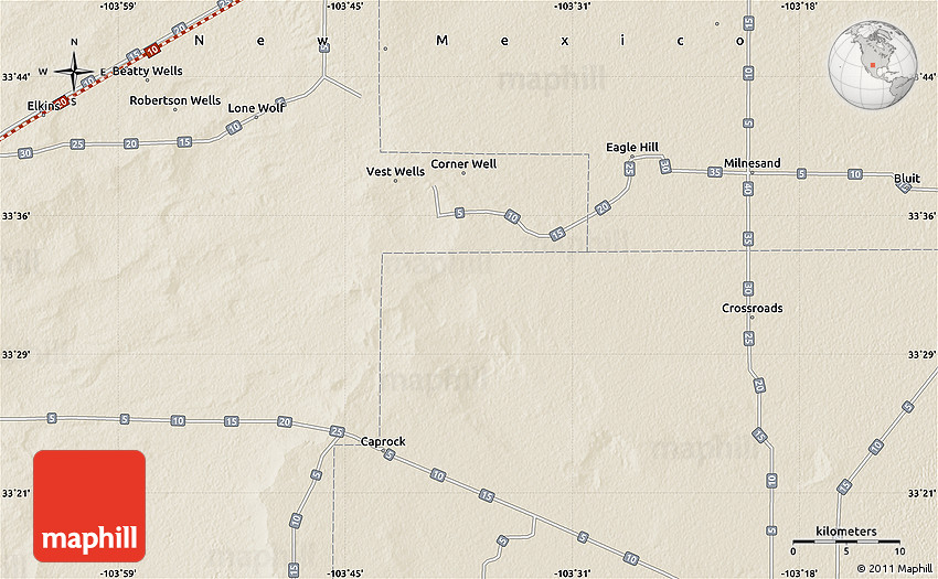 The value of Maphill lies in the possibility to look at the same area from several perspectives. Maphill presents the map of the area around 33° 32' 52" N, 103° 37' 30" W in a wide variety of map types and styles.